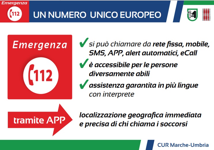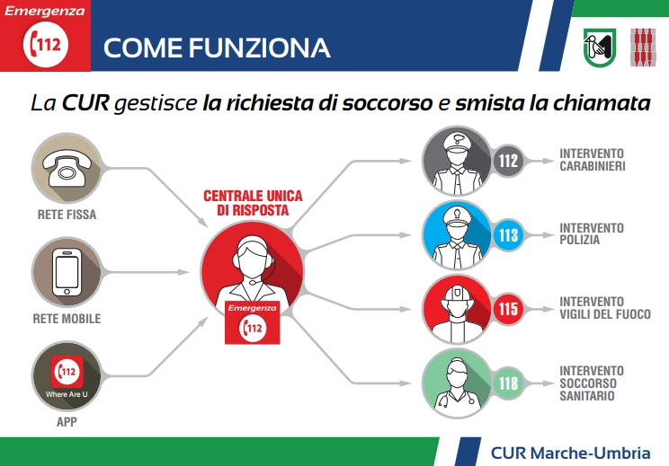 Risponde una Centrale Unica di Risposta (CUR Marche-Umbria) che gestisce la richiesta di soccorso smistando subito la chiamata al servizio di riferimento.