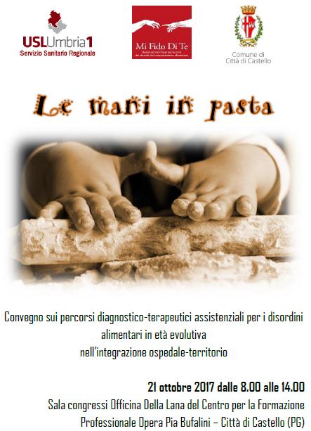 “Le mani in pasta”, il 21 ottobre 2017 dalle ore 08.00 alle 14.00 a Città di Castello (PG) nella Sala congressi Officina Della Lana del Centro per la Formazione Professionale Opera Pia Bufalini un convegno sui percorsi diagnostico-terapeutici assistenziali per i disordini alimentari in età evolutiva nell’integrazione ospedale-territorio.