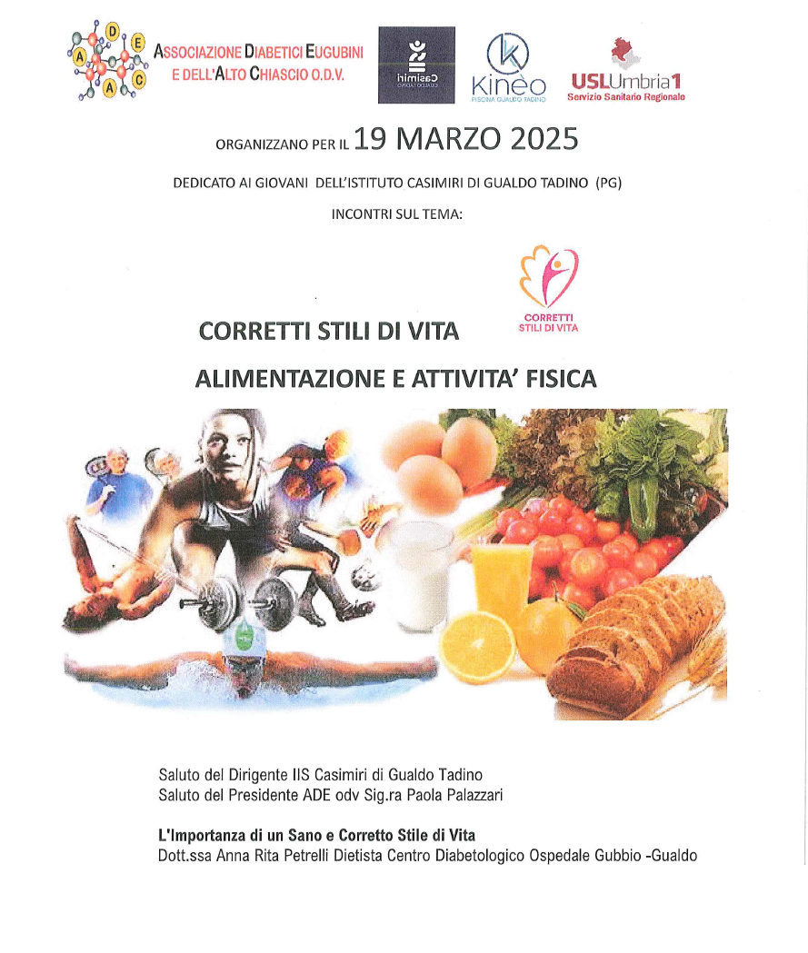 Sono questi gli obiettivi che si prefigge il progetto, eseguito tra Febbraio e Marzo , denominato“Salute Ben…Essere” promosso dall’Associazione Diabetici Eugubini (ADE odv), in collaborazione con la Usl Umbria 1, l’Istituto Cassata Gattapone e l’Istituto IS Casimiri, rispettivamente della città di Gubbio e Gualdo Tadino, i quali mediante la condivisione di idee, competenze, responsabilità e risorse, si sono impegnati a costruire ed attuare lo stesso.